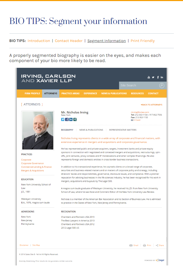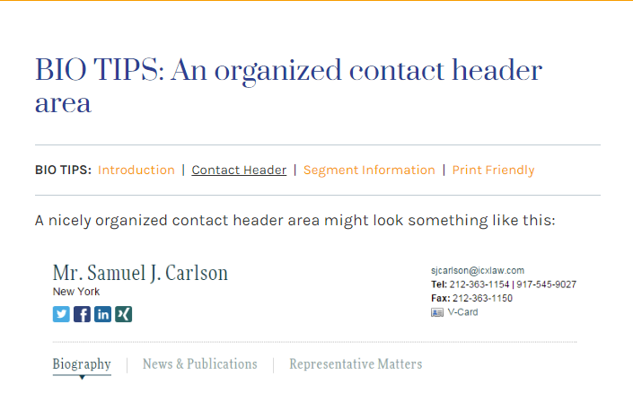 A biography with all of your CV information embedded in a running narrative makes research more tedious for your prospects. Instead, break your bio up into clearly segmented blocks with practice areas, admissions, education, representative matters, and other key components nicely spaced. The remaining narrative will be shorter and more on point.