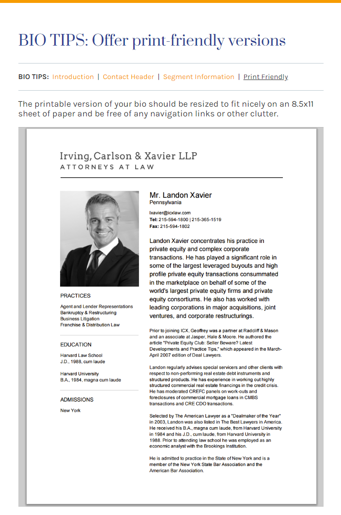 Prospects conducting due diligence on a law firm will frequently print pages from the website to read offline or pass on to others. Make sure that your bios are well-formatted and print crisply without clutter or unnecessary web navigation.